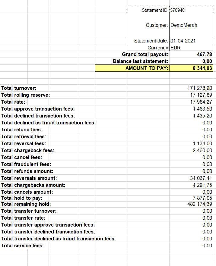 The calculated balance of the current period for each type of user is added to its current balance. The balance is maintained individually for each currency. For merchants, the balance is also detailed by the reseller, if available. The company’s balance sheet is not taken into account. The counterparty’s current balance is defined as the sum of the current balance of all its statements, minus paid and frozen funds.