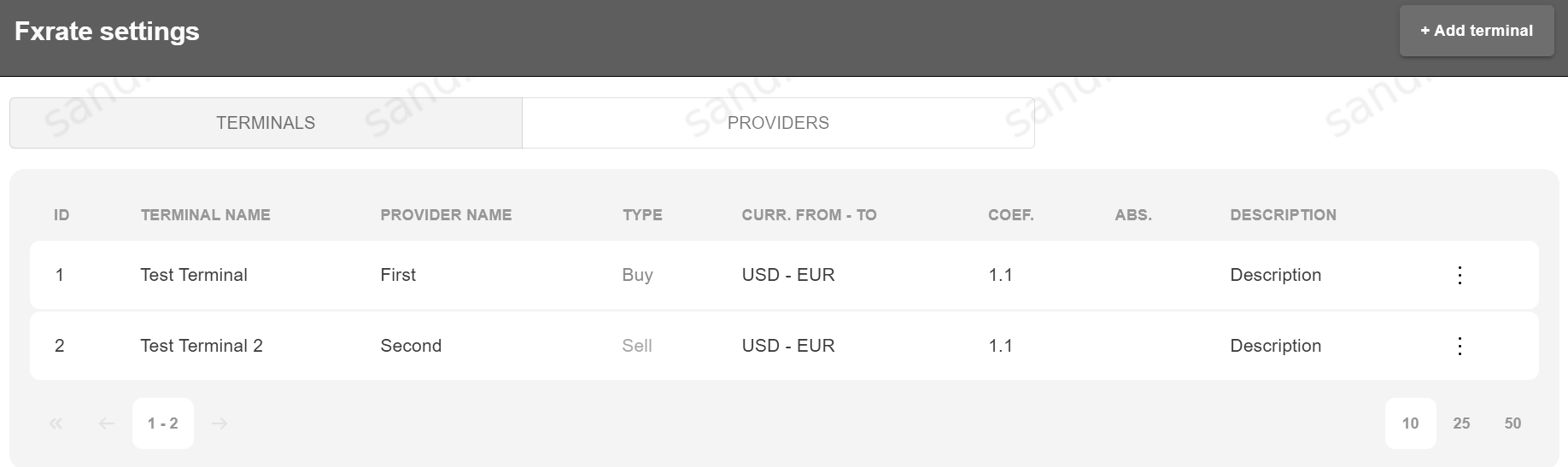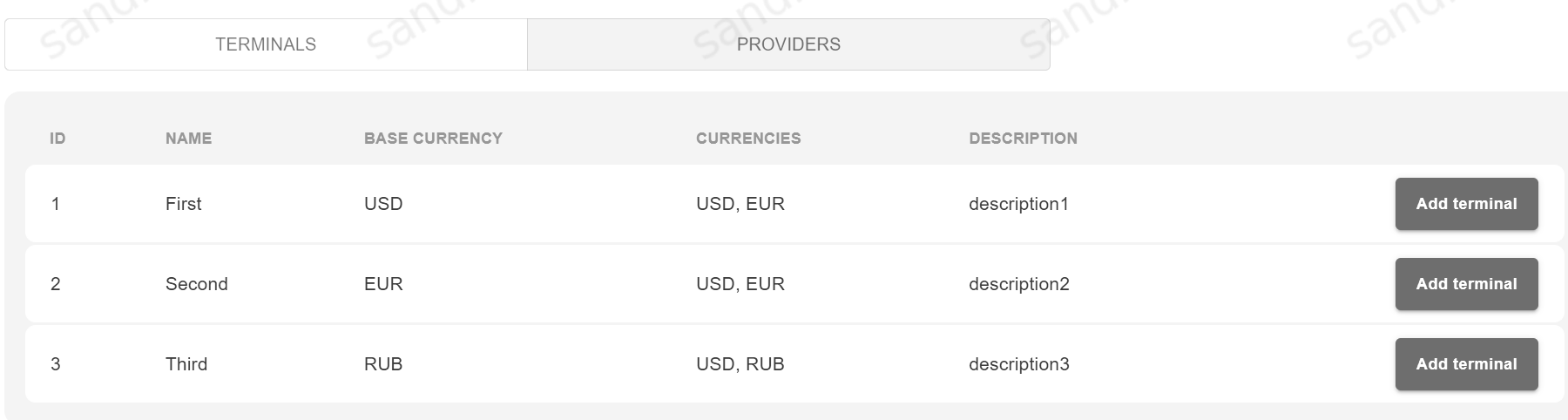 Providers section shows all available Providers and allows to add new Terminal to any Provider.