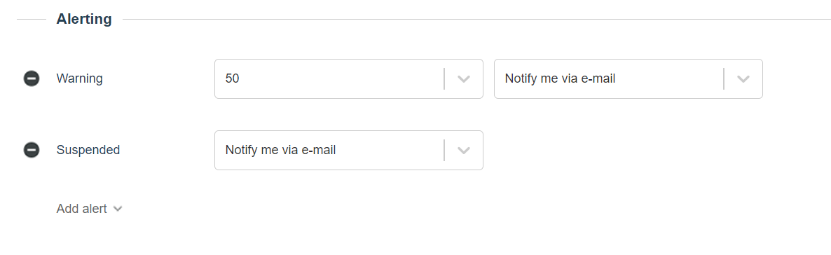 Also, it’s possible to set different alerts for limits by pressing Add alert: