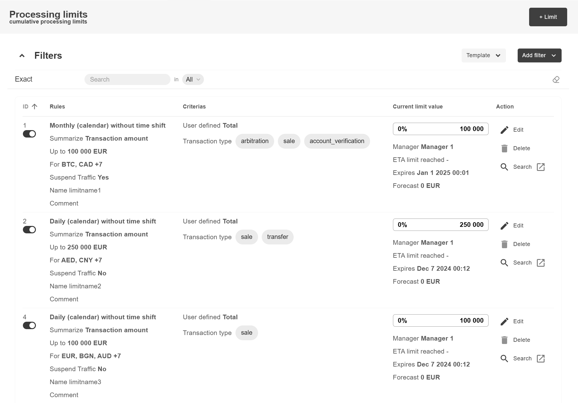 The limit can be found by its ID or name. Multiple limits can be found using search criteria. Search criteria can be saved as a template for future use. The list of created limits can be sorted by their ID. (Last created, First created)